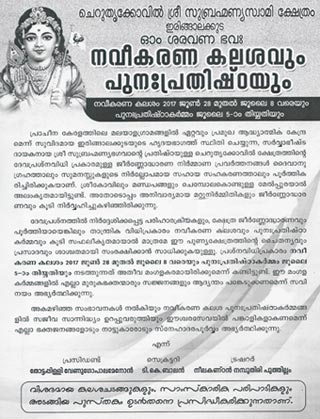 ചെറുതൃക്കോവിൽ ശ്രീ സുബ്രഹ്മണ്യസ്വാമിക്ഷേത്രത്തിൽ തൈപ്പൂയ മഹോത്സവം ജനുവരി 21ന്