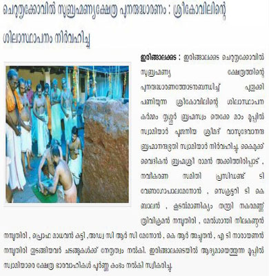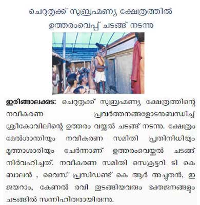 ഇരിങ്ങാലക്കുട : നവീകരണകലശവും പുനഃ പ്രതിഷ്ടയും കഴിഞ്ഞു നടയടച്ച ചെറുതൃക്കോവില് സുബ്രഹ്മണ്യ സ്വാമി ക്ഷേത്രത്തിലെ നട തുറപ്പ് ശനിയാഴ്ച പുലര്ച്ചെ 5ന് നടക്കും. തുടര്ന്ന് തത്വ ഹോമം, തത്വ കലശ പൂജ, തത്വ കാലാഭിഷേകം, പരി കാലാഭിഷേകം, കുംഭ കാലാഭിഷേകം, ശ്രീഭൂതബലി തുടങ്ങിയവ നടക്കും. പ്രധാന വഴിപാട് പറനിറക്കല് , നടതുറക്കല് പ്രമാണിച്ച് ഉച്ചക്ക് 11 :30 മുതല് പാണ്ടിസമൂഹം ഹാളില് പ്രസാദ ഊട്ട് ഉണ്ടായിരിക്കുമെന്ന് ഭരണസമിതി ഭാരവാഹികളായ ടി കെ ബാലന്, കെ ആര് അച്ചുതന്, ഒ കൊച്ചുഗോവിന്ദന്, ജയശങ്കര് ചക്കഞ്ചാത്ത്, പുത്തില്ലത് നീലകണ്ഠന് നമ്പൂതിരി, സി. നാരായണന്കുട്ടി, ഇ ജയരാമന് എന്നിവര് അറിയിച്ചു. ശനിയാഴ്ച വൈകിട്ട് 7 മുതല് 8:30 വരെ പെരിങ്ങോട്ട് സുബ്രഹ്മണ്യന് ആന്റ് പാര്ട്ടി അവതരിപ്പിക്കുന്ന ഇടക്കയില് നാദവിസ്മയം എന്ന പരിപാടി അരങ്ങേറും.