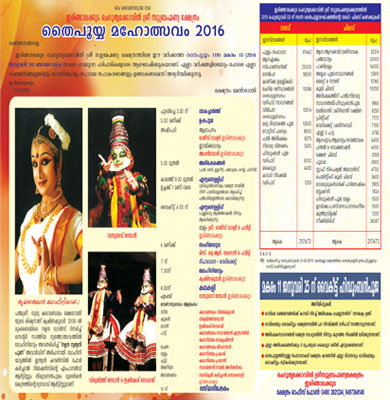 തൈപ്പൂയദിനത്തിൽ ദീപാരാധനക്കു ശേഷം ഗുരുവായൂർ ഭജനമണ്ഡലി അവതരിപ്പിക്കുന്ന സമ്പ്രദായ ഭജനയും നടക്കും. അന്നേദിവസം 12 :30 മുതൽ പ്രസാദ ഊട്ടും ഉച്ചതിരിഞ്ഞ് കാവടിയാട്ടവും ഉണ്ഢയിരിക്കും തുടർന്ന് നട അടക്കുമ്പോൾ രാജീവ് വാര്യർ ആലപിക്കുന്ന സോപാനസംഗീതവും തുടർന്ന് വർണ്ണമഴയും ഉണ്ടായിരിക്കും. ജനുവരി 22ന് ചൊവ്വാഴ്ച 6:45ന് ദീപാരാധനയും തുടർന്ന് ചിന്തുപാട്ടോടുകൂടി മഹാഹിഡുംബൻ പൂജയും നടക്കും.