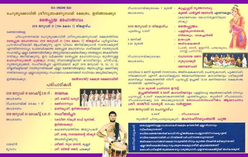 ഇരിങ്ങാലക്കുട ചെറുതൃക്കോവിൽ ശ്രീ സുബ്രഹ്മണ്യസ്വാമിക്ഷേത്രത്തിൽ തൈപ്പൂയ മഹോത്സവം ജനുവരി 21ന് തിങ്കളാഴ്ച ആഘോഷിക്കുന്നു. ഉത്സവത്തിനോട് അനുബന്ധിച്ചു 19-ാം തിയ്യതി വൈകീട്ട് 5:30 ന് രാജീവ് വാര്യർ അവതരിപ്പിക്കുന്ന തായമ്പകയും 20-ാംതിയ്യതി വരവീണ സ്കൂൾ ഓഫ് മ്യുസിക്ക് ഇരിങ്ങാലക്കുടയുടെ സംഗീതാർച്ചനയും കലാമണ്ഡലം മോഹനതുളസിയുടെ ശിഷ്യ പാർവ്വതി മേനോന്റെ കുച്ചുപ്പുടി നൃത്തസന്ധ്യയും ഉണ്ടായിരിക്കും.